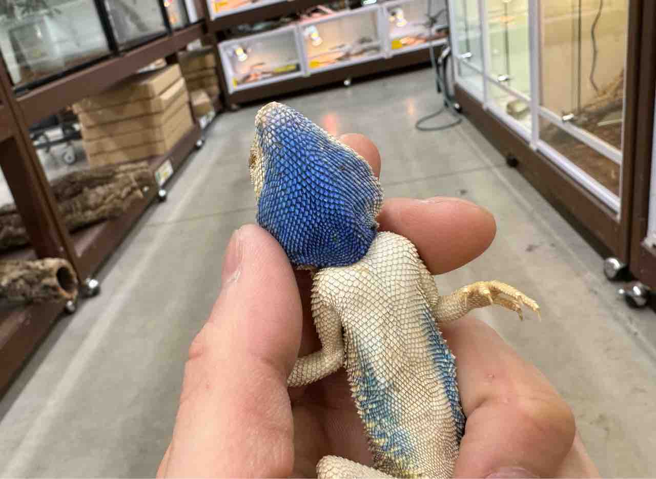 こちらも小型フトアゴと呼びたくなる様な容姿のエジプト産アガマ。繁殖期のオスの顎下の青色は目を疑うほどの美しさ。メスはメスで背中にキューブ状の赤色模様が入り違う良さがあります。複数入荷!コオロギバリバリ食べています◎