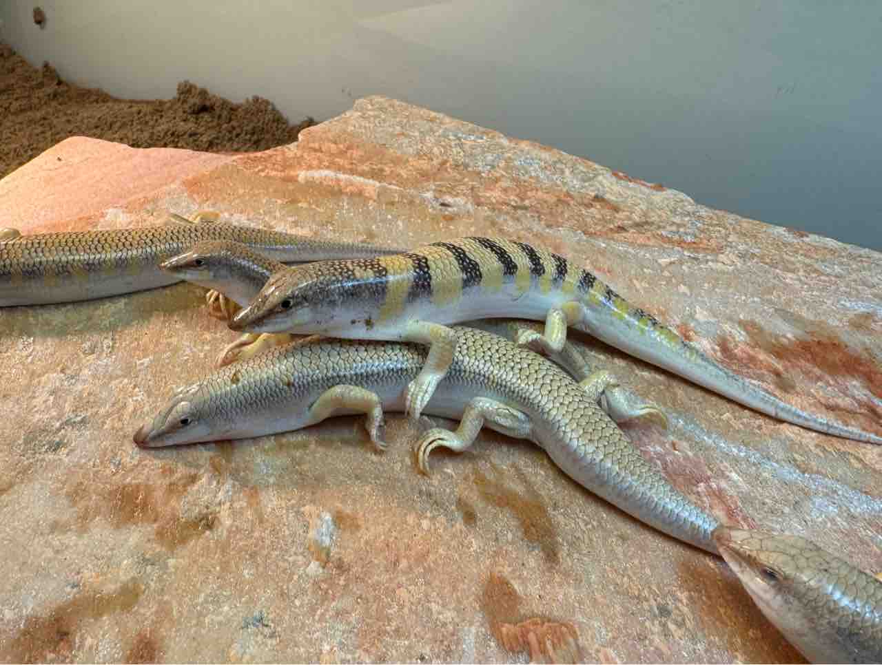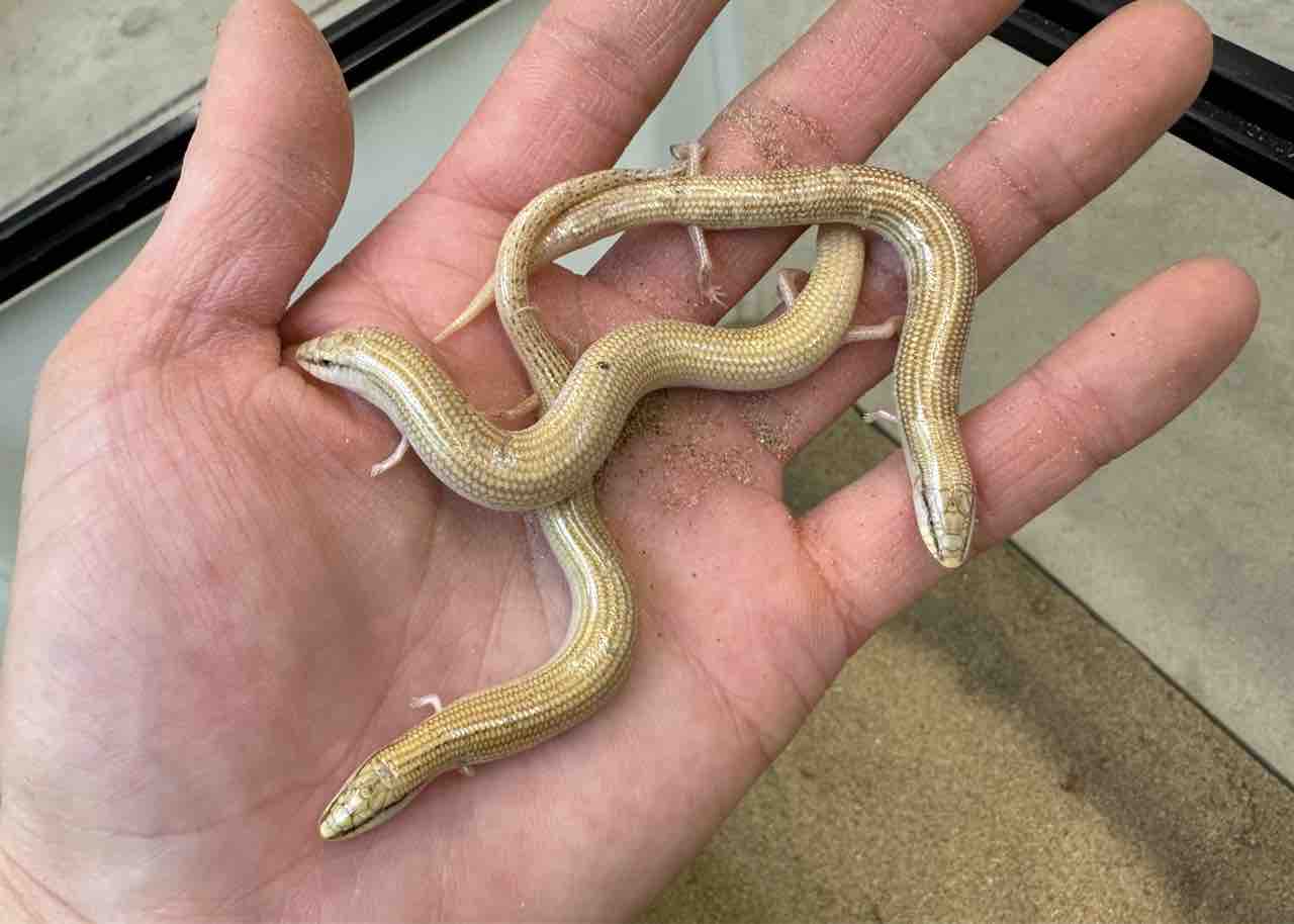 申し訳程度についた手足が可愛らしいカラカネトカゲ!光沢のある体つきも本属の特徴で手に乗せてもツルツル指の間を抜けていき床材の底に潜っていきます。同種間での小競り合いも少ないことから多頭飼育もOK!数割もありますので是非複数匹での飼育を!