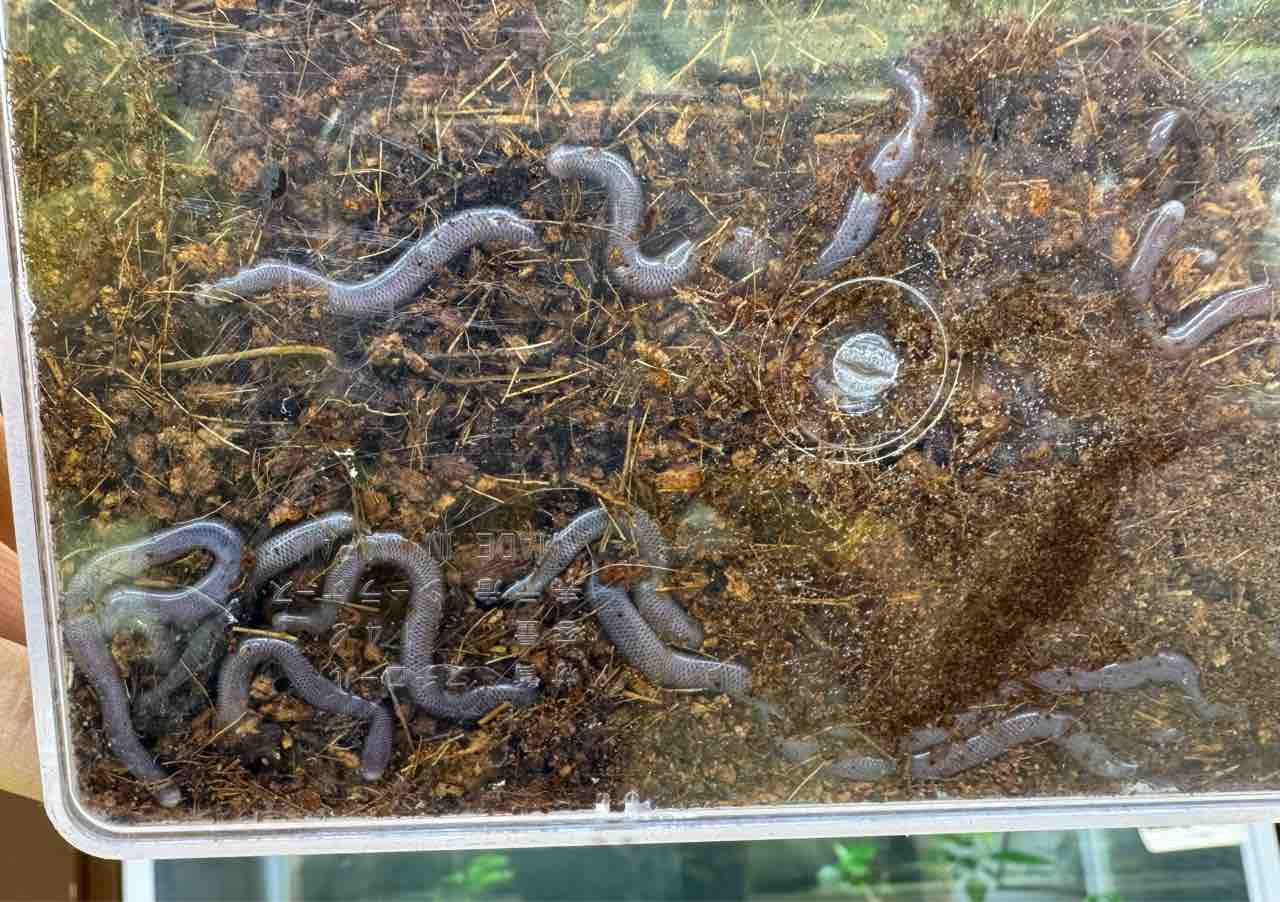 世界中に広く分布するメクラヘビの仲間で日本でも主に南西諸島でよく発見されます。ミミズだとか寄生虫だとか(良い意味で)揶揄される種類ですがよーく見るとちゃんと眼もついており意外と可愛らしい(笑)。普通のプラケースでは脱走される危険性もありますのでコバエ侵入を防止するようなカブクワ用のプラケで飼育すると良きです◎複数入荷!