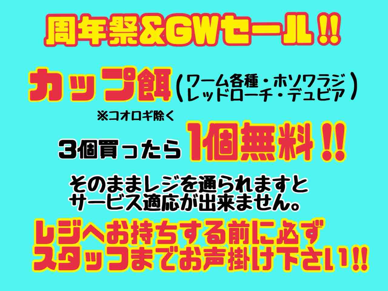 セール期間中はハチクラオリジナルのカップ餌(ワーム各種、ローチ各種、ホソワラジ)は3カップご購入いただければさらに追加で1カップ無料でプレゼント!ストックもしやすい種類の餌なのでいつもより多めに買い溜めもオススメです◎※カップコオロギは対象外となります。